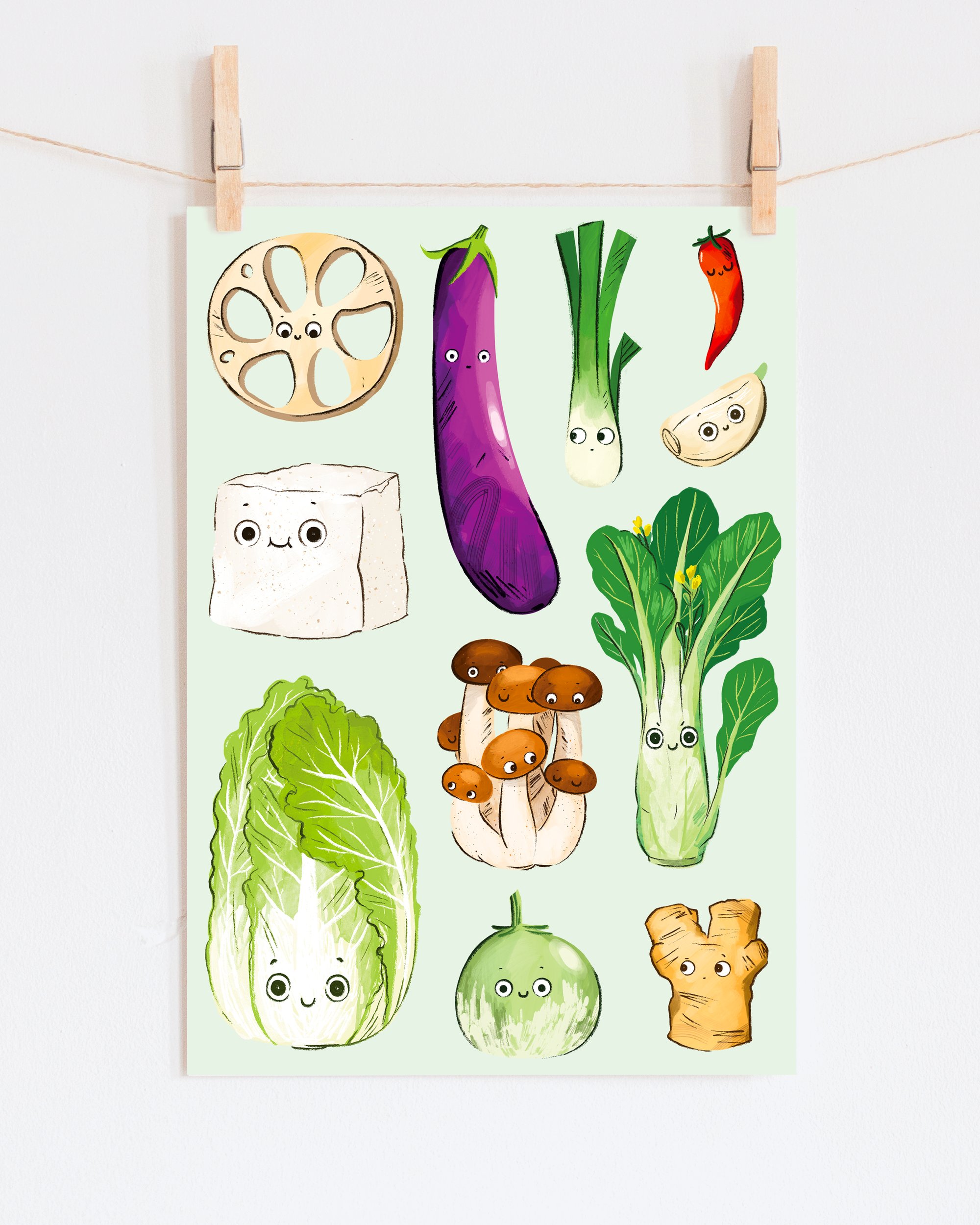 Illustrated by Natelle, featuring some of her favourite veggies/fungi/roots/aromatics used in Asian cooking, including lotus root, long aubergine, spring onion, chilli, tofu, nappa cabbage, mushrooms (shimeji is pictured), choi sum, Thai auberine, and ginger.